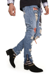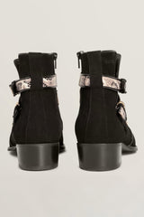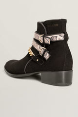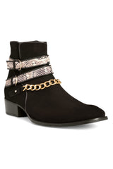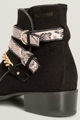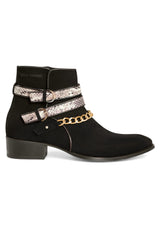 A luxury SNAKE BUCKLE BLACK BOOTS made of the finest suede leather, strapped with snake Imitation leather belt, adjustable with gold color chain and hardware. Zippers run through the inner opening of the boot. MAD TIGERS Logo embossed on the upper side.