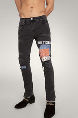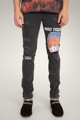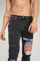 VINTAGE BANDANA ARTPATCHES DURCHGEHEND. MAD TIGERS GEDRUCKTES LOGO AUF DER VORDERSEITE. 2 SCHWARZE CHIANEN AN DER TAILLE, 1 SCHWARZE CHIAN UNTER DEM KNIE, 1 SCHWARZE KETTE ÜBER DEM KNIE. KLASSISCHE 5-TASCHEN-JEANS. EINE SILBERNE METALLPLATTE AUF DER TASCHE. 2 REISSVERSCHLÜSSE AN BEIDEN SEITEN DER KNÖCHEL.