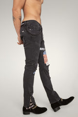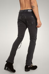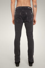 Slim fit VINTAGE BLACK DENIM. ABRASIONS AND DISTRESSING THROUGHOUT